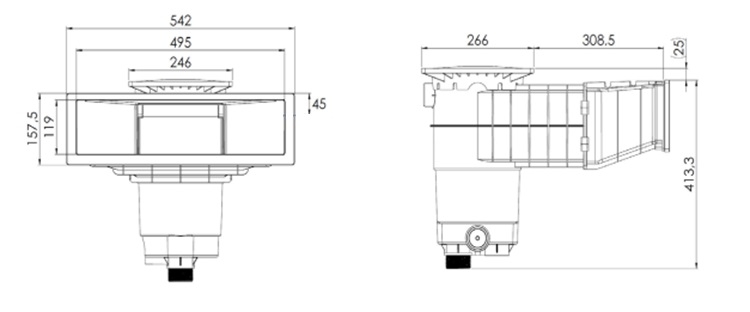 Skimmer muito discreto, concebido para funcionar com o nivel de água a apenas 45 mm do topo do skimmer.